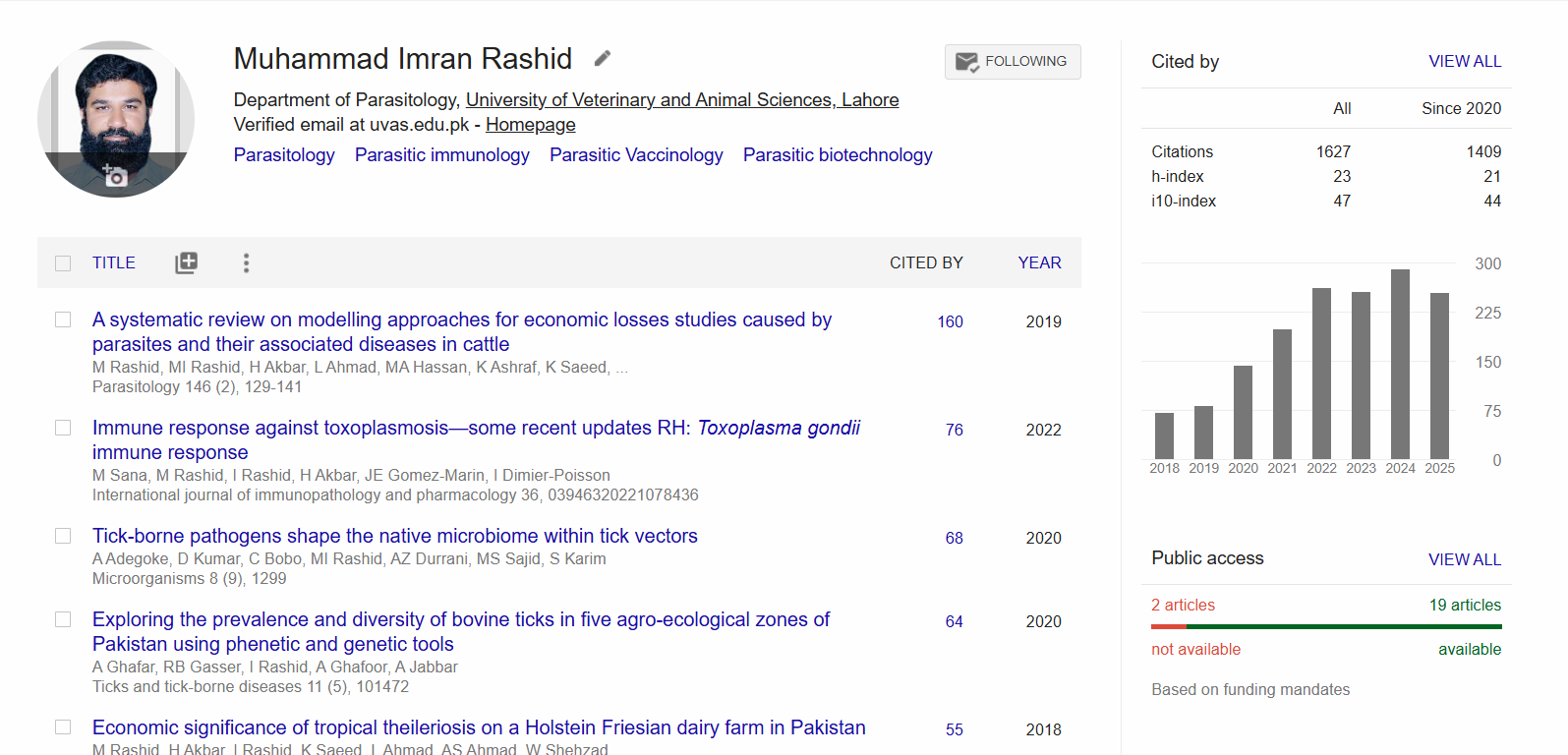 - Rashid, M., J. Liu, G. Guan, J. Wang, Z. Li, M. A. Hassan, M. I. Rashid, M. U. Mukhtar, J. Luo and H. Yin (2019). “In vitro influence of Theileria annulata on the functions of bovine dendritic cells for stimulation of T lymphocyte proliferation.” Parasitology, 147(1), 1-32.