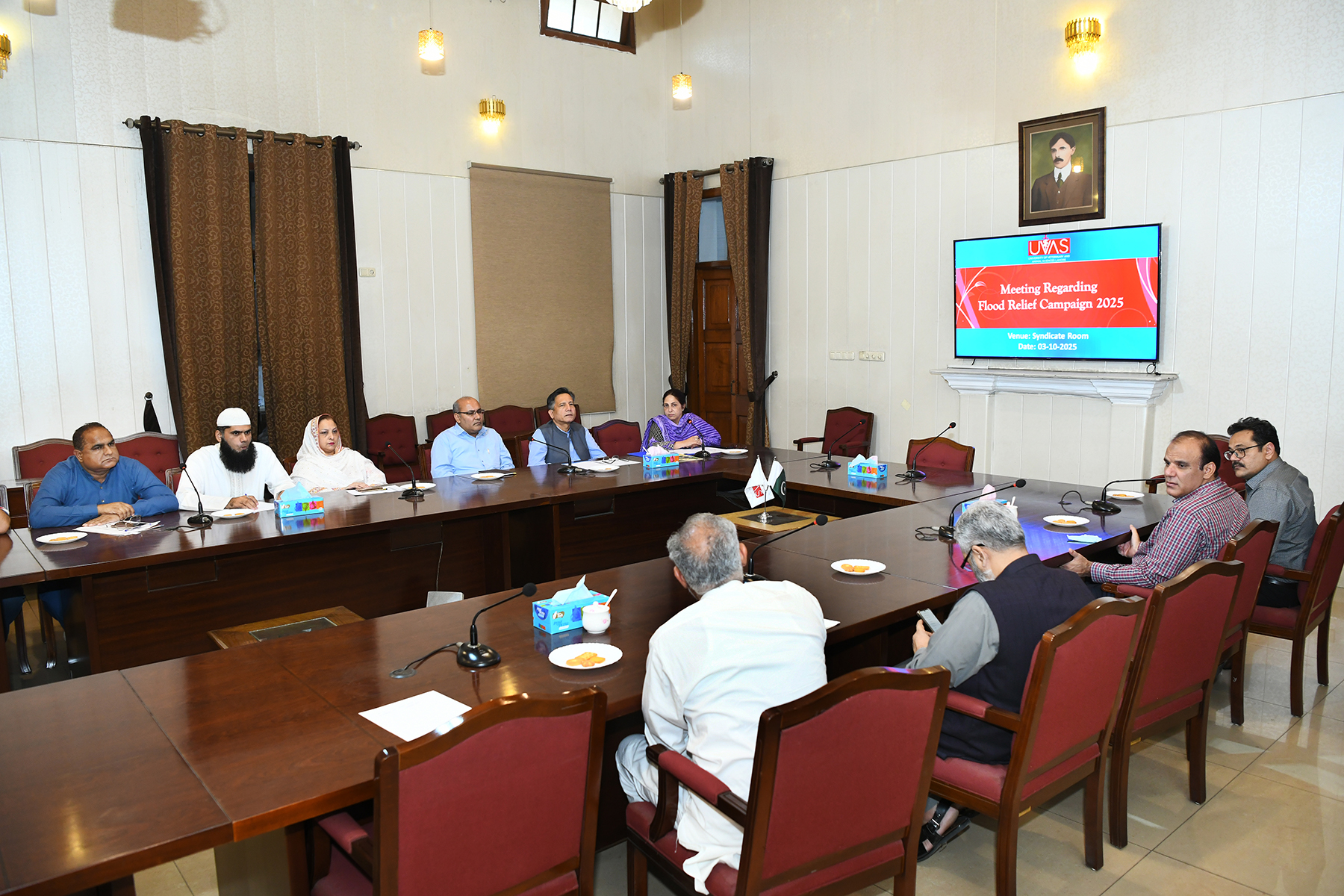 While addressing the participants of meeting, Prof Dr Aneela constituted different committees for fund raising, vaccine collection from allied pharmaceutical industries and for field work in the flood affected areas to provide treatment facilities at the door step of livestock farming families to save their animals. The meeting decided that flood relief teams consisting of students and faculty members from the sub-campuses of the UVAS would provide relief items, food items, medicines and veterinary services to the flood-affected areas, while relief supplies would be provided from the city campus.